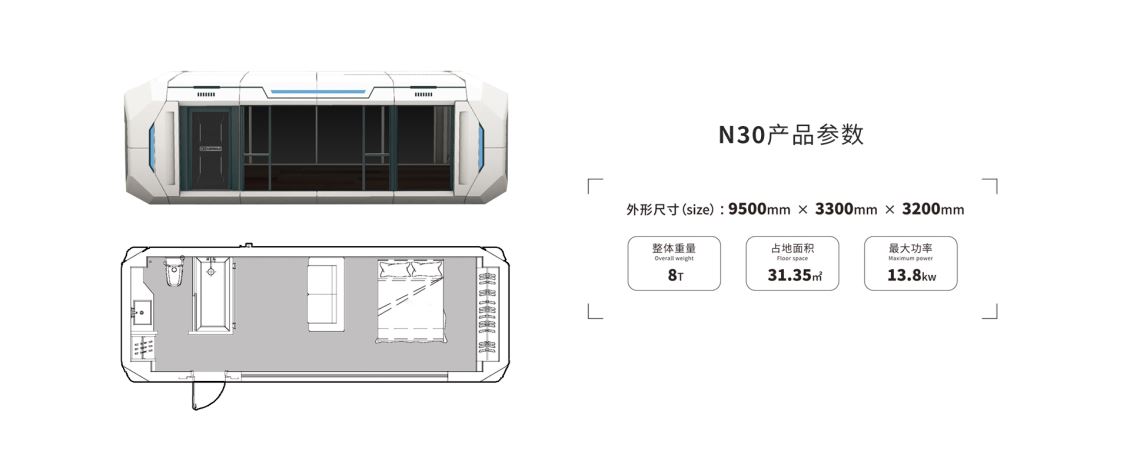 室内采用 “一室一卫” 大开间布局,空间利用率高,功能分区清晰且不局促。无需复杂土建,可直接落地接水电使用,既能作为城市家庭的补充居住空间,也能满足乡村自建房的现代升级需求,为传统住房场景提供更具科技感与舒适性的新选择。